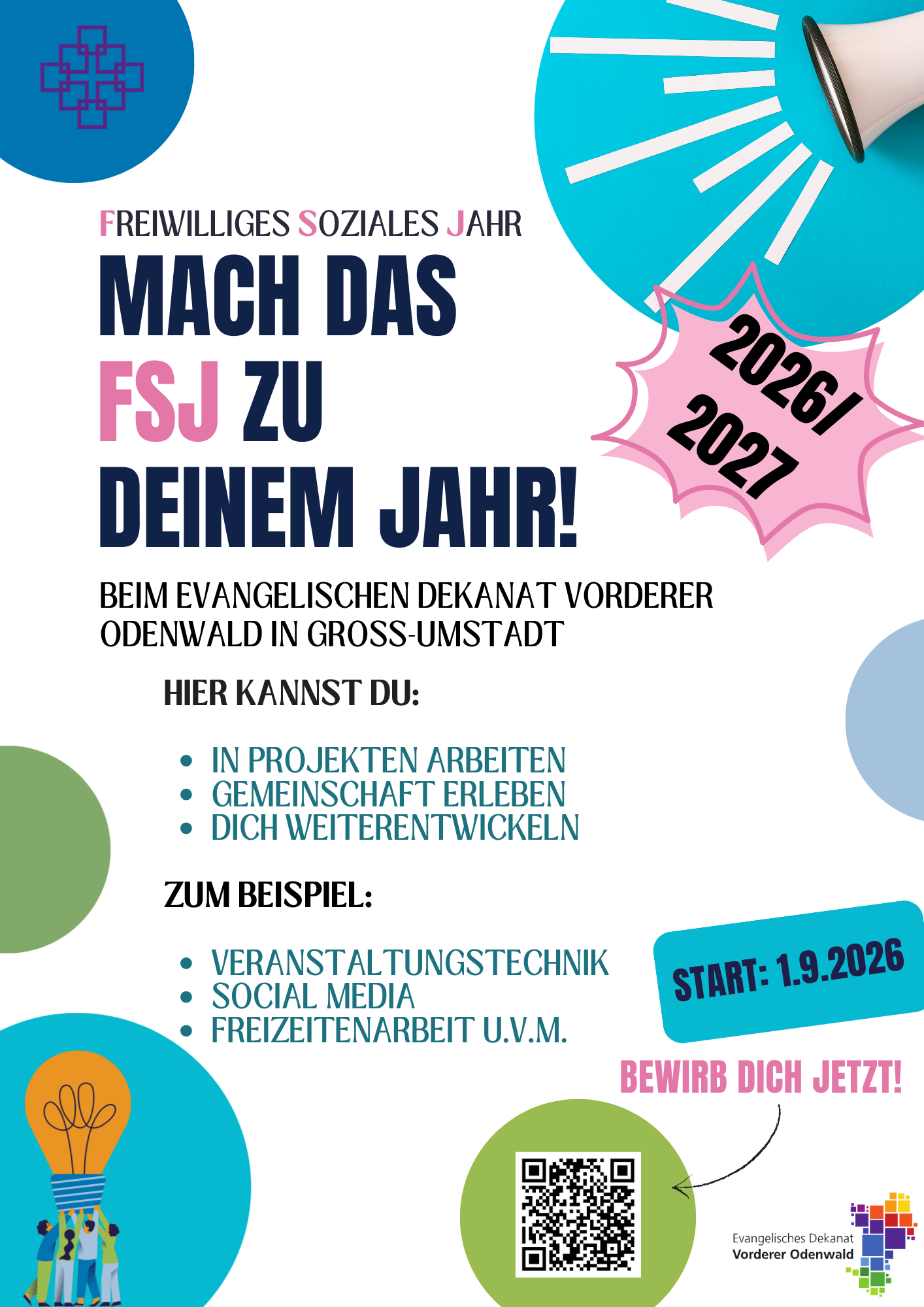 Das Evangelische Dekanat Vorderer Odenwald bietet zum wiederholten Mal ein Freiwilliges Soziales Jahr (FSJ) an. Hier können sich junge Menschen zwischen 16 und 27 Jahren beruflich und persönlich orientieren. Es handelt sich um eine freiwillige ganztägige Hilfstätigkeit im Dekanat mit Sitz in Groß-Umstadt. Das FSJ orientiert sich an Lernzielen, die individuell mit den Freiwilligen festgelegt werden. Es beginnt am 1. September 2025 und dauert zwölf Monate.